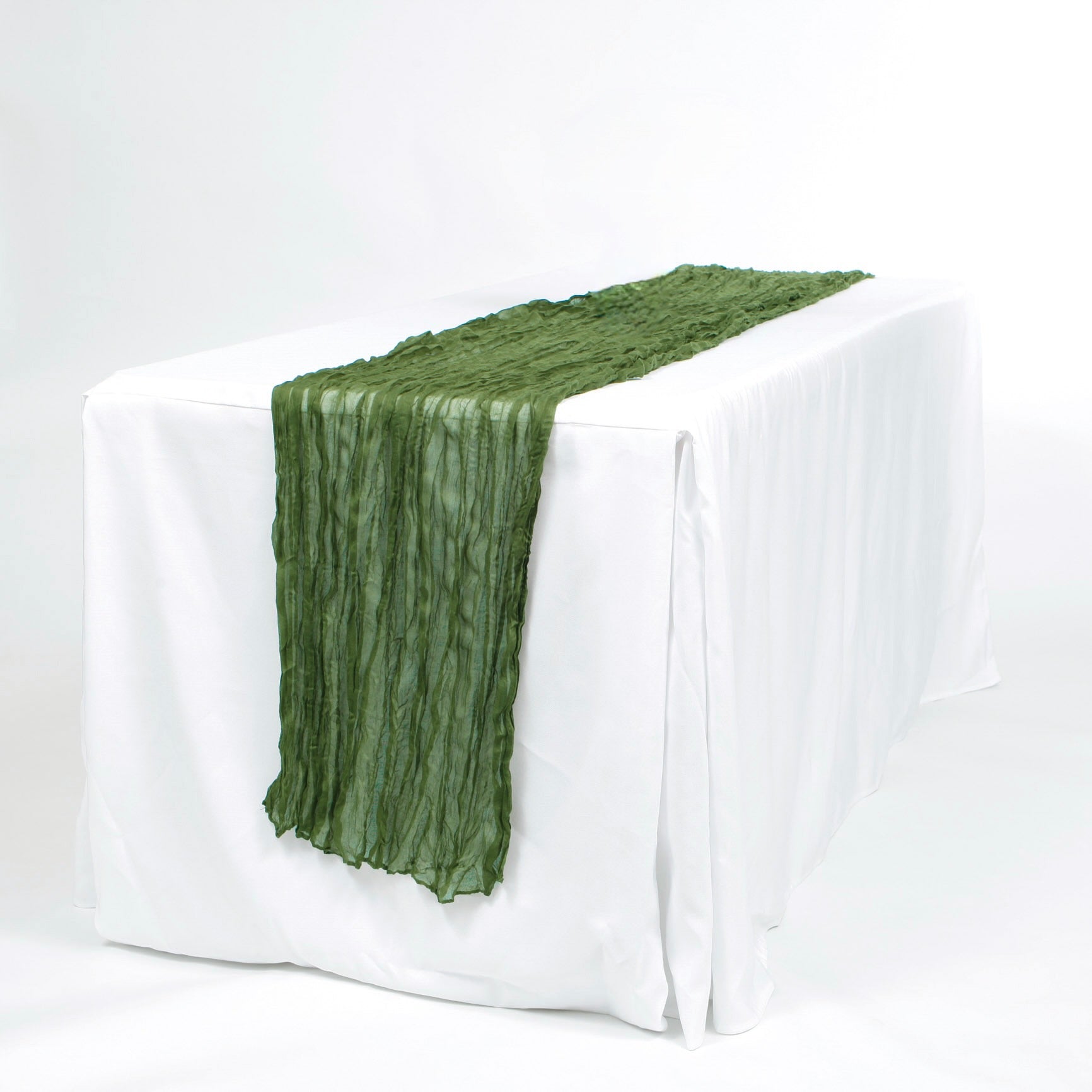 Introducing the enchanting Olive Cheesecloth Table Runner – a stunning addition to your event decor that effortlessly infuses Boho elegance into any setting. Also known as a gauze table runner, this exquisite piece captures the heart of your celebration with its natural crinkled texture and relaxed rustic charm.