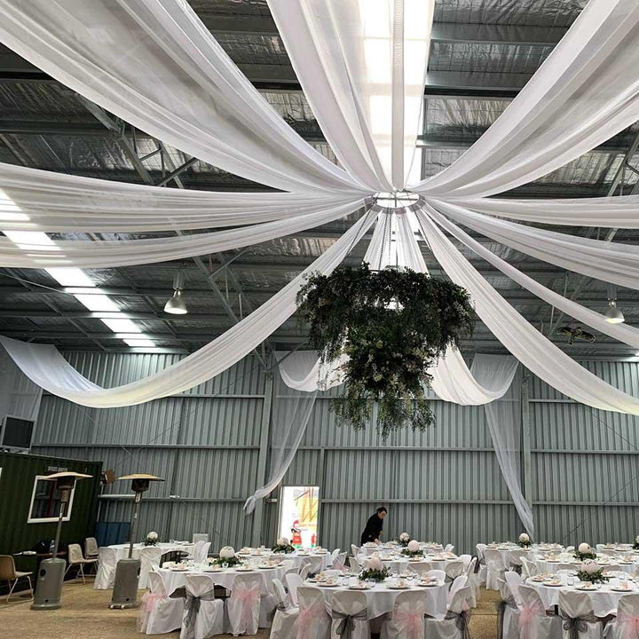 Design: One end has a velcro fold-over for attaching to a centre ring. The other end has a curtain rod loop stitched. You can utilise the curtain rod loop to attach to our ceiling draping acrylic tubing, our backdrop stands or thread string through it and tie tight for a ruffled look!