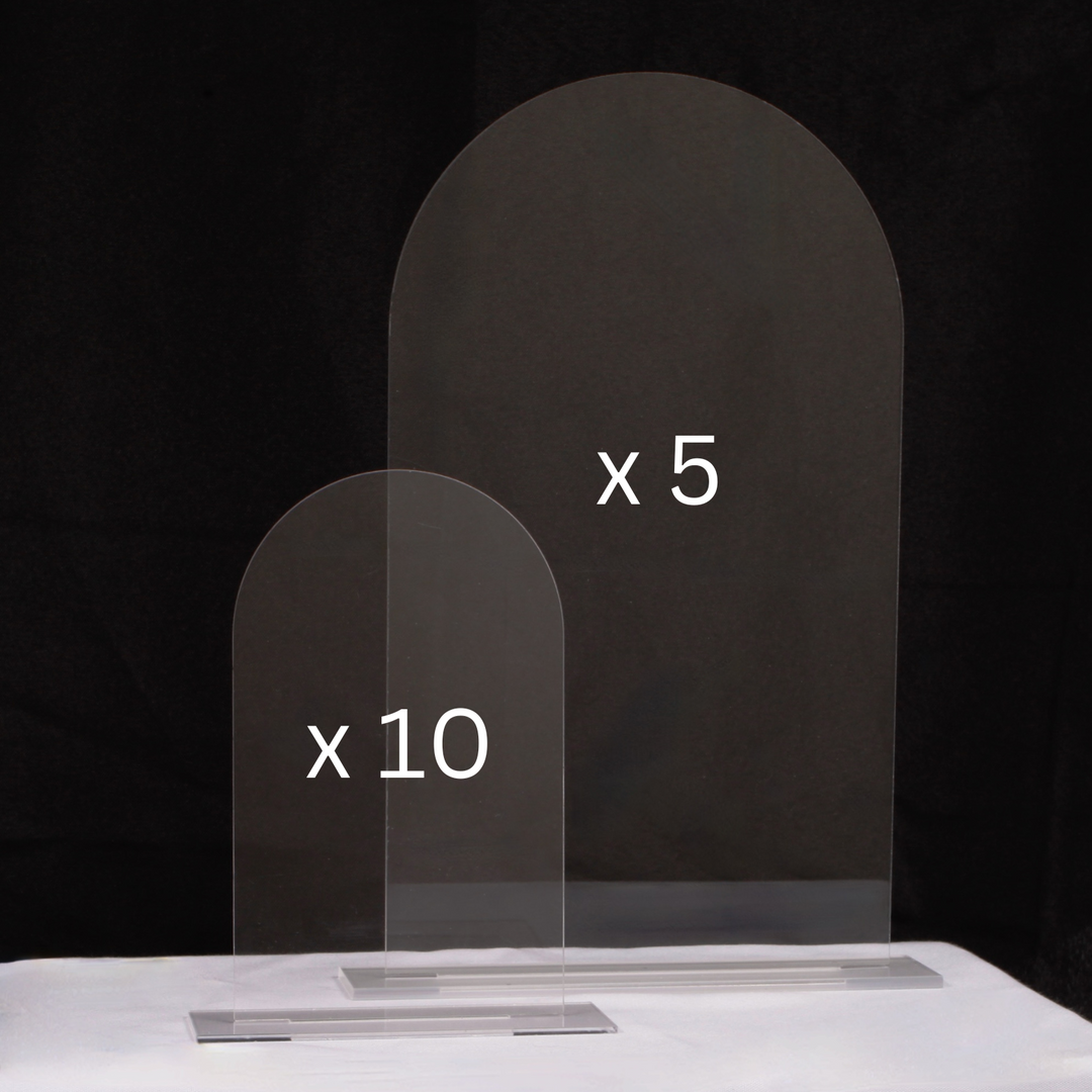 Made from clear acrylic in a soft arch shape, these signs are very versatile. The smaller ones work beautifully as table numbers whereas the large ones can be used as menus, welcome signs, instructional signs or for your gift/card tables.