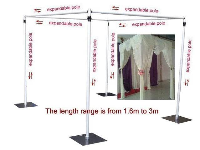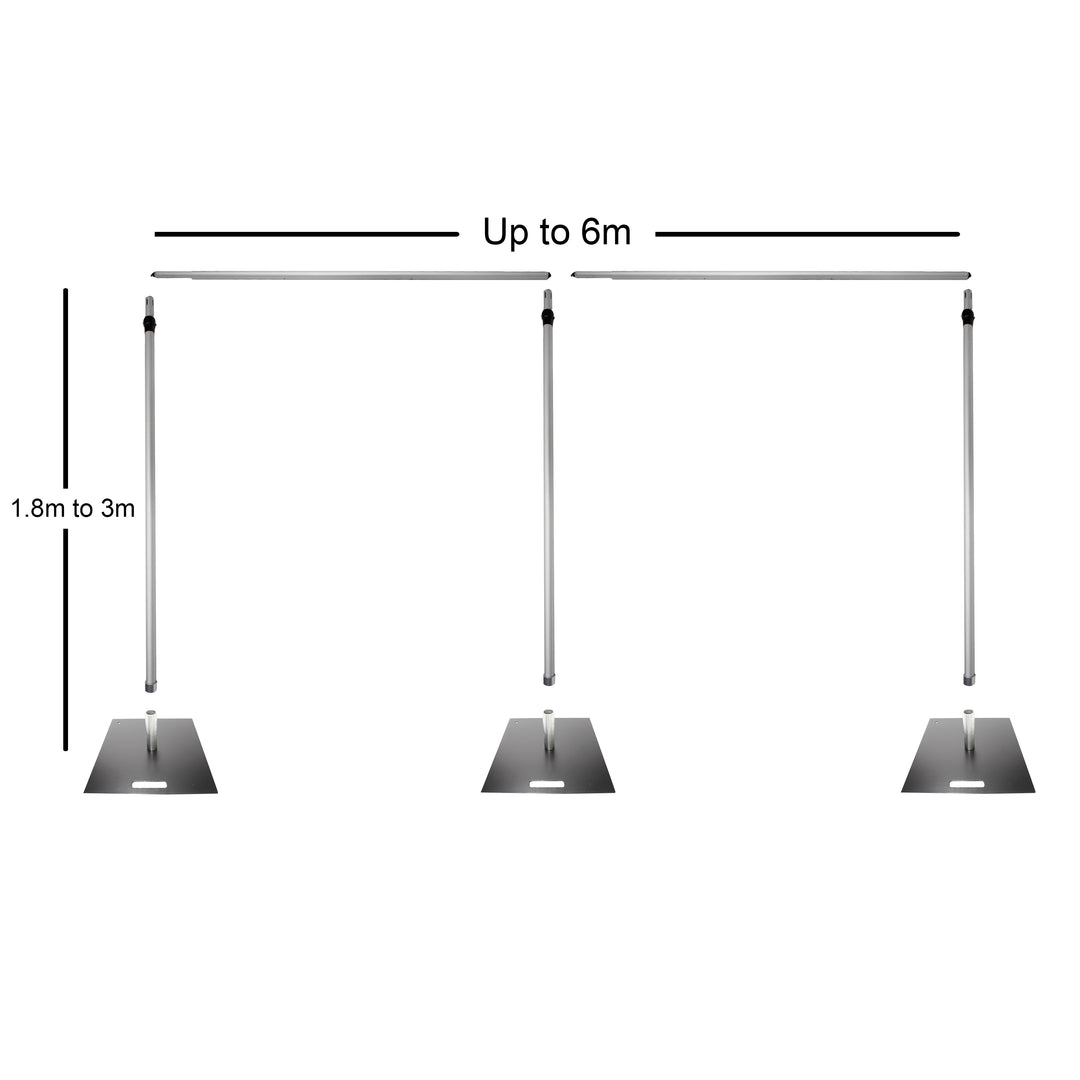 Lightweight yet durable, this pipe and drape system is quick to assemble and ideal for displaying Ice Silk, Sequin, Tulle and Chiffon, Velvet and Lycra backdrops, plus Artificial Flower or Sequin Shimmer walls. Adjustable up to 3m high and 6m long, and anything in between. Perfect size for all our 6mx3m Ice Silk Satin backdrops and Tulle and Chiffon Backdrops! The crossbars also feature secure locking points at 2.3m and 3m.